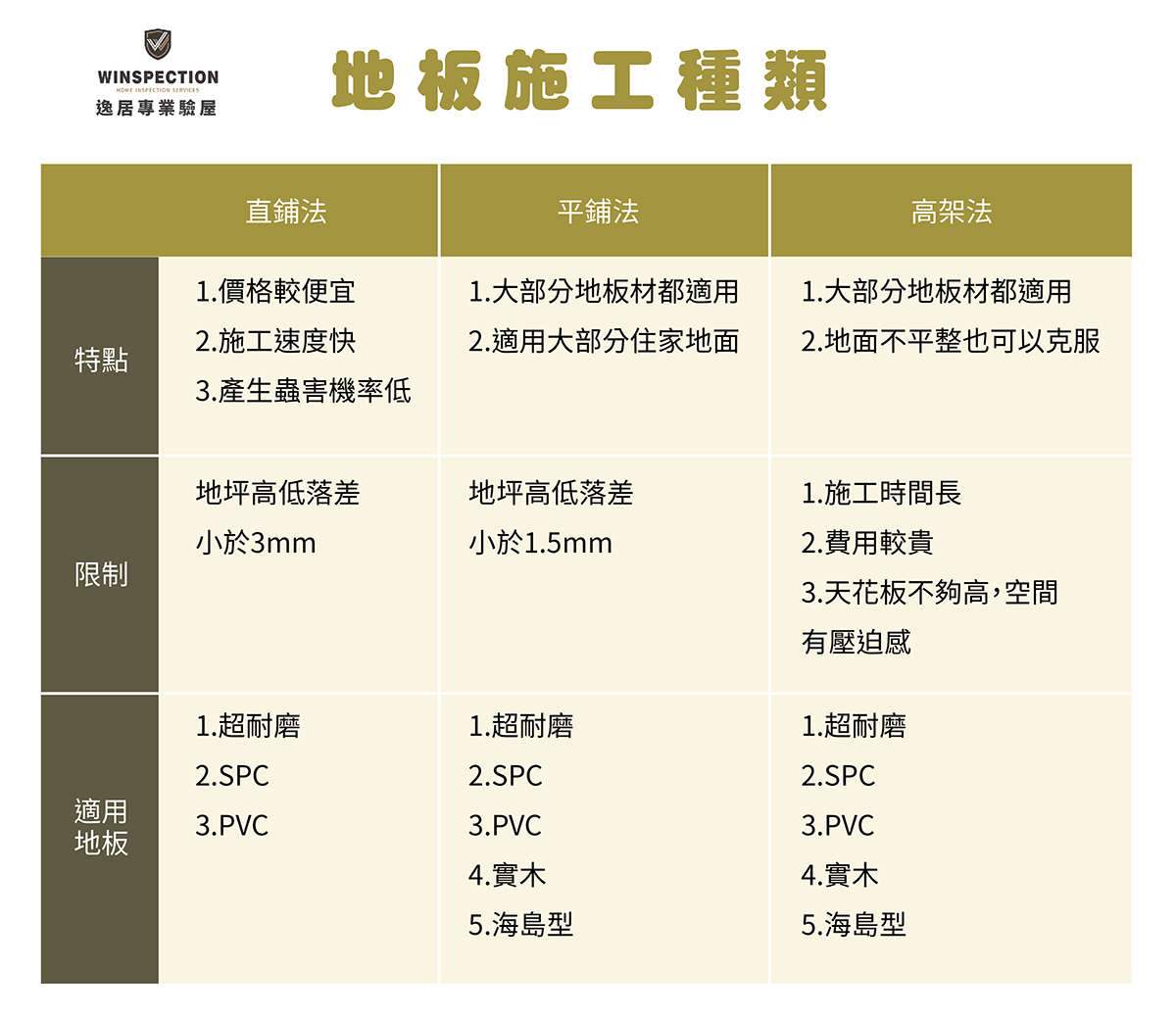 直鋪地板是最方便、快速的一種作法,但需要地坪非常平整才能施作,地坪高地落差需在3mm以下。